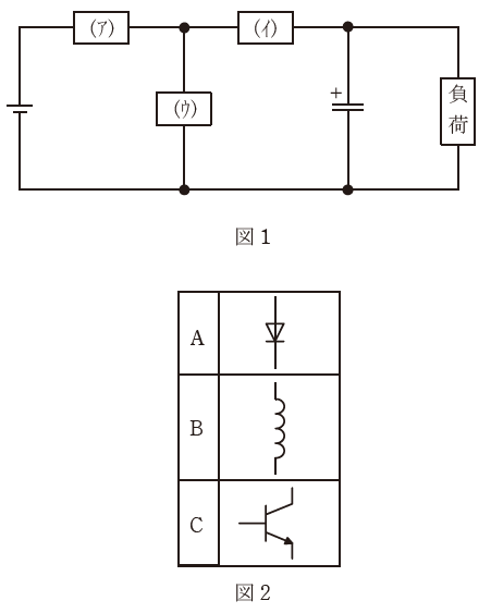 図1は直流チョッパ回路の基本構成図を示している。降圧チョッパを構成するデバイスを図2より選んで回路を構成したい。(ア)~(ウ)に入るデバイスの組合せとして,正しいものを次の(1)~(5)のうちから一つ選べ。