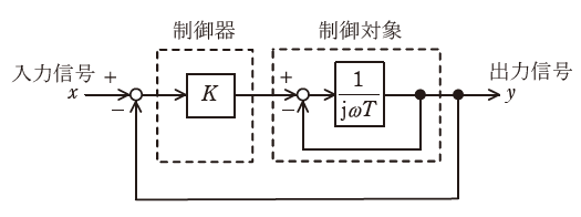 図は,出力信号 y を入力信号 x に一致させるように動作するフィードバック制御系のブロック線図である。次の(a)及び(b)の問に答えよ。