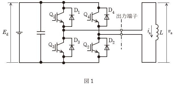 図1は,IGBTを用いた単相ブリッジ接続の電圧形インバータを示す。直流電圧Ed[V]は,一定値と見なせる。出力端子には,インダクタンスL[H]の誘導性負荷が接続されている。