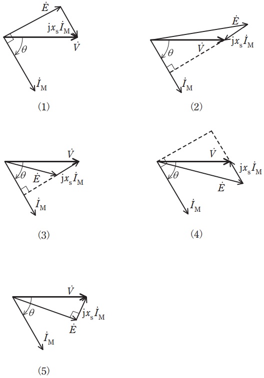 円筒形三相同期電動機において,電動機の励磁電流を調整して,遅れ力率θで運転しているものとする。このとき,供給電圧[V] ,電機子電流[A]としたとき,誘導起電力[V],並びに同期リアクタンスによる電圧降下[V]の関係を示すベクトル図として,正しいものを次の(1)~(5)のうちから一つ選べ。