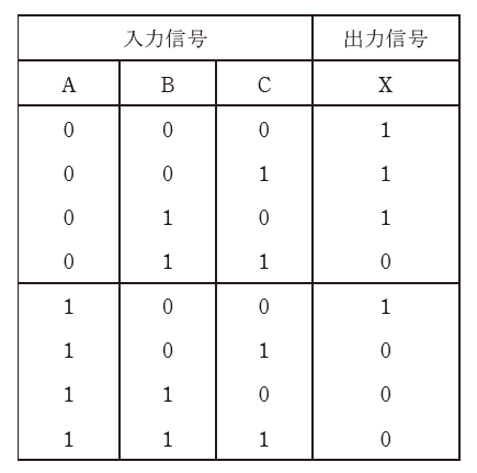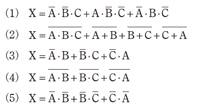 入力信号がA,B及びC,出力信号がXの論理回路が次の真理値表を満たしているとき,Xの論理式として,正しいものを次の(1)~(5)のうちから一つ選べ。