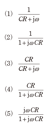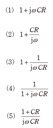 この回路の入力量V1(jω)に対する出力量V2(jω)の周波数伝達関数を表す式として、正しいものを次の(1)~(5)のうちから一つ選べ。